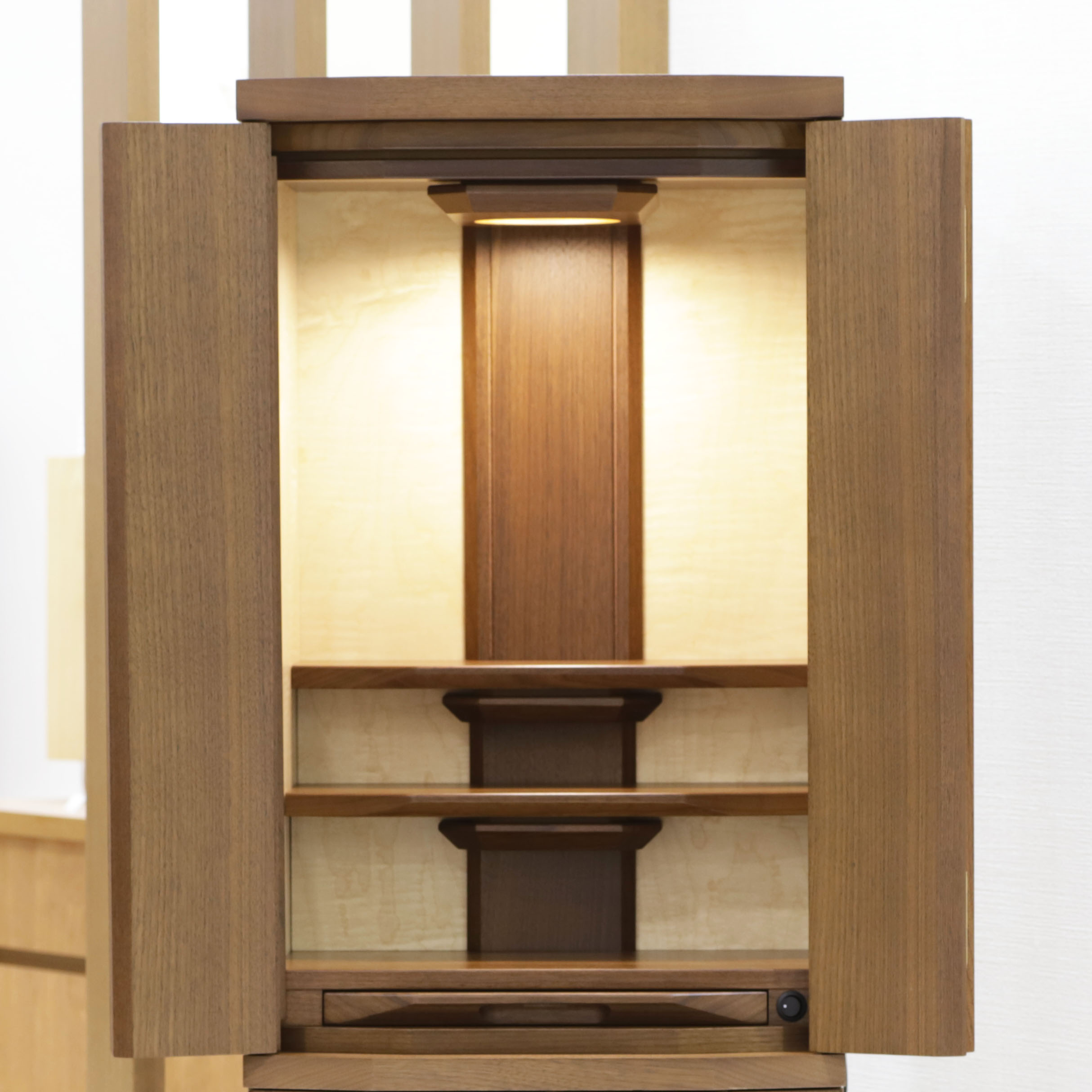 メープルのきめ細やかで艶のある質感が美しいです。職人の技が光る曲線技法は柔らかい印象。内部の段差がしっかりとあるので大きめのお位牌も起きやすく、すでにお位牌がある方の買い替えにもおすすめです。
