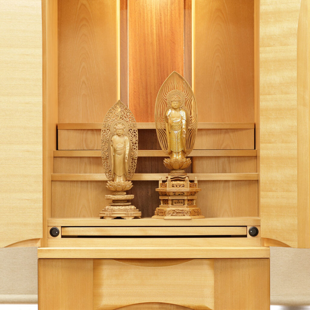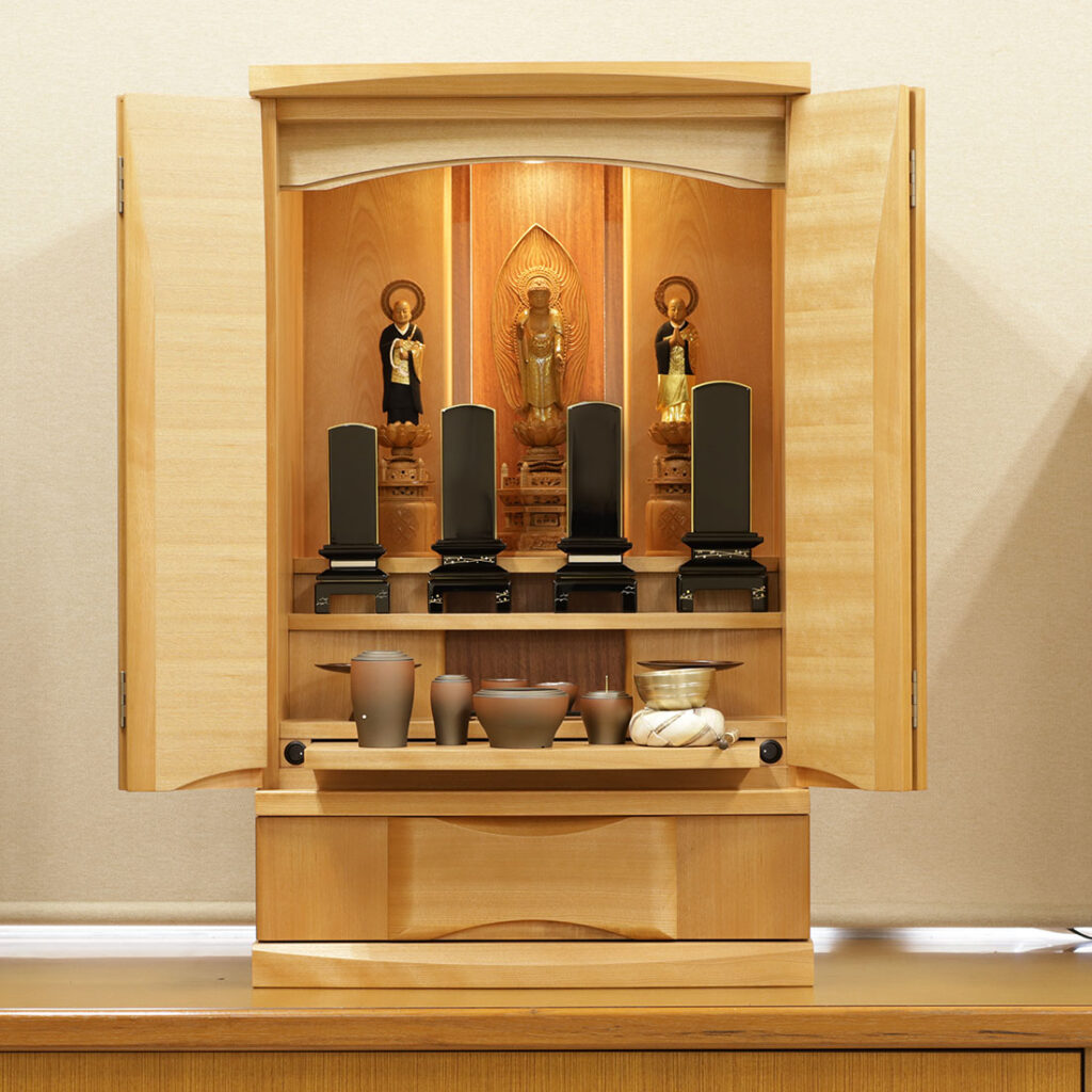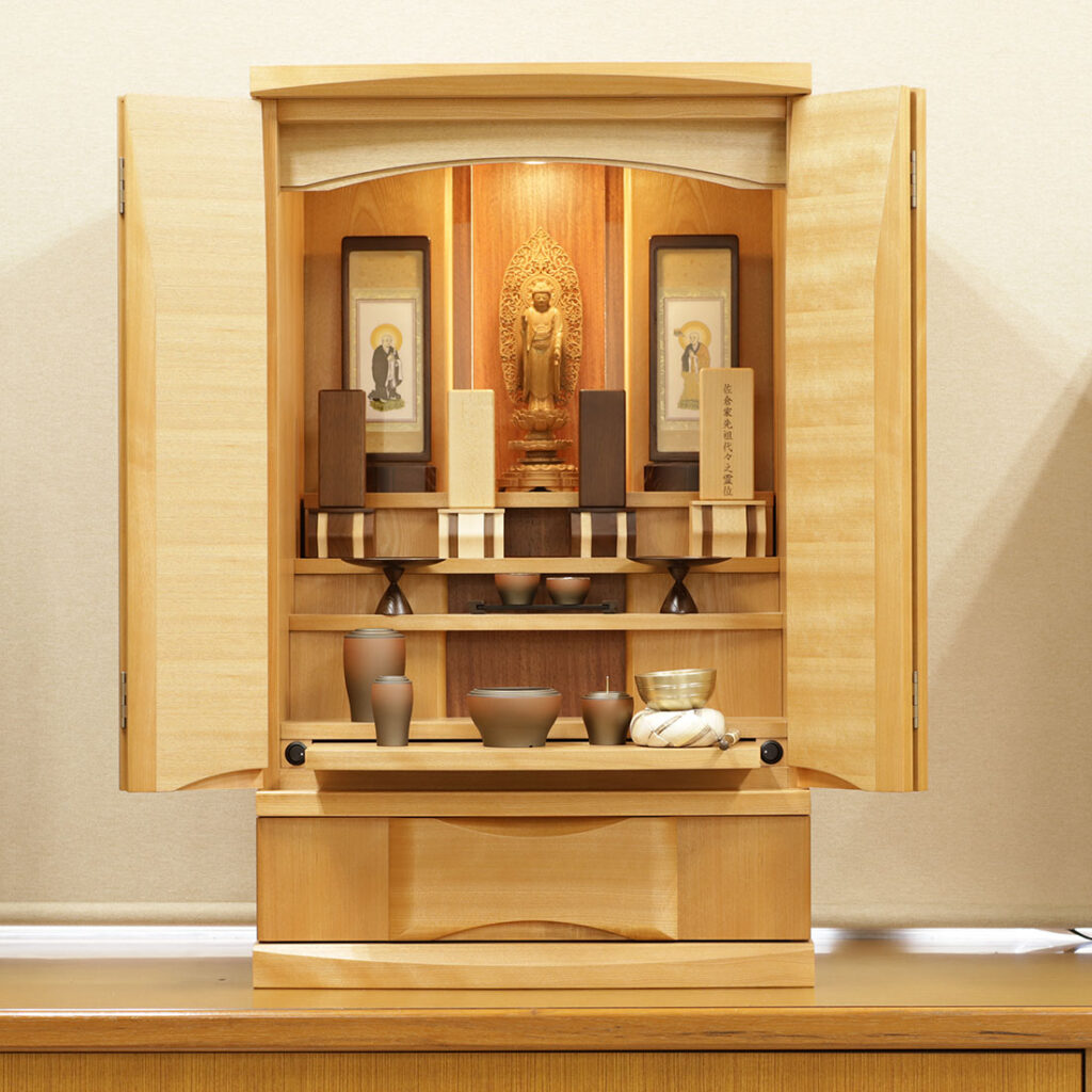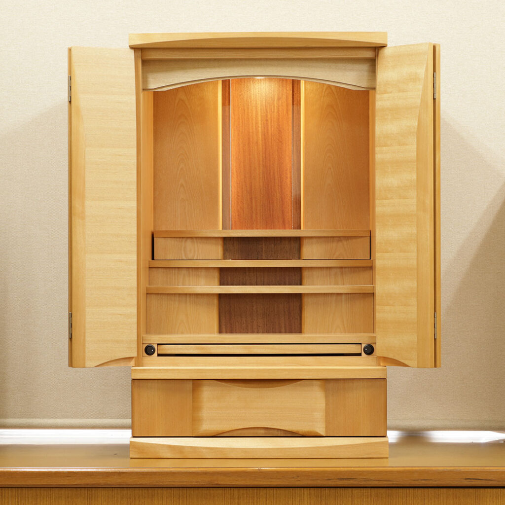 樺桜の光沢のある明るい木目が全体をやさしい雰囲気にし、毎日手を合わせる空間を穏やかにします。