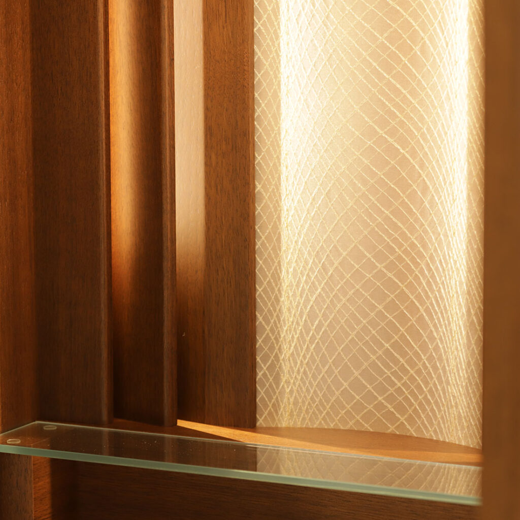 本尊背面には緩やかなカーブを描く半透明アクリル板に、糸で表現した格子模様をあしらい、奥行のある立体的な表情を演出しています。