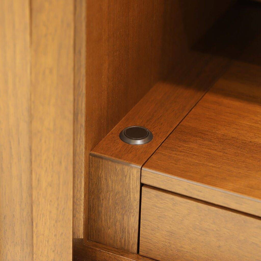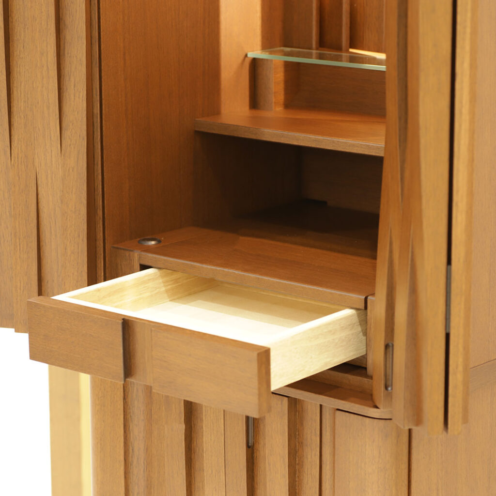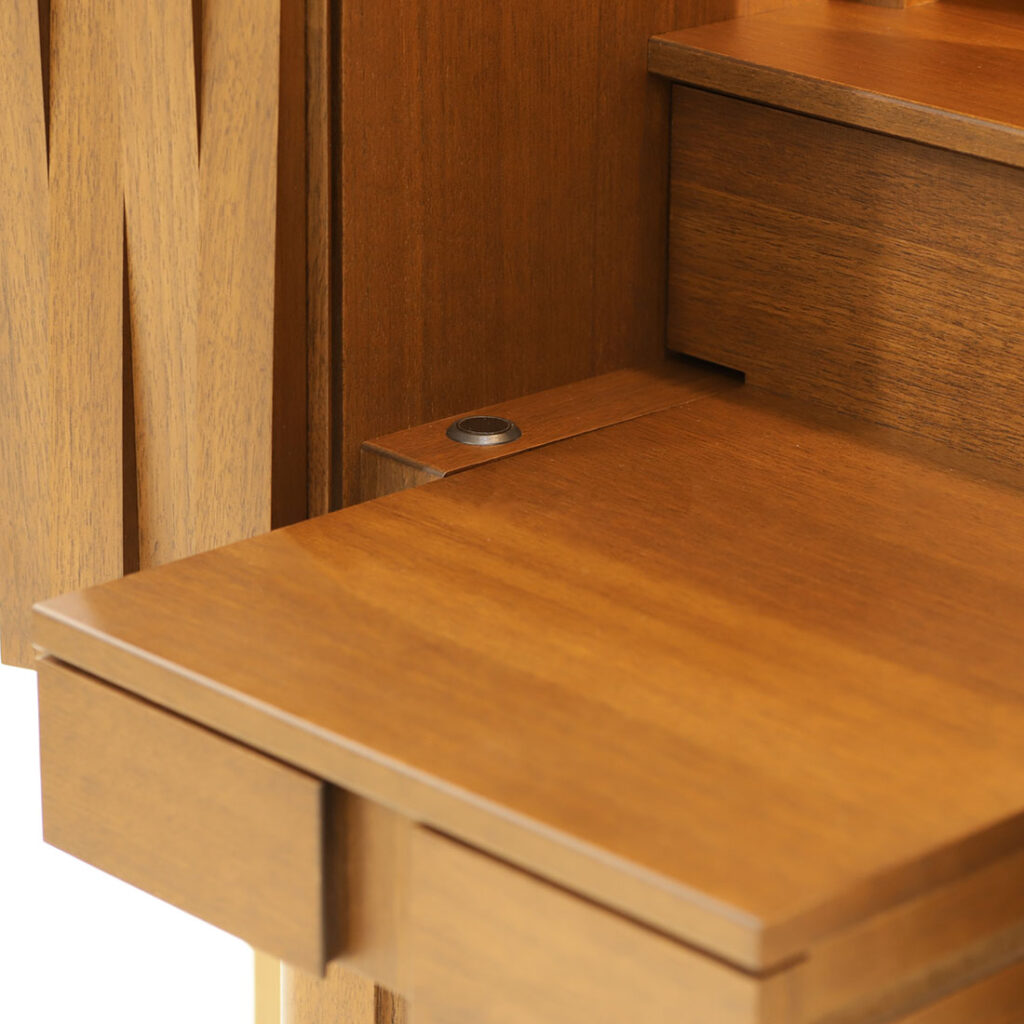 仏壇下段はスライド式で手前に引き出すことができ、広々としたお供えスペースとしてお使いいただけます。さらに引き出し収納も備えており、線香やローソクなど使用頻度の高い仏具をすっきりと収納できます。